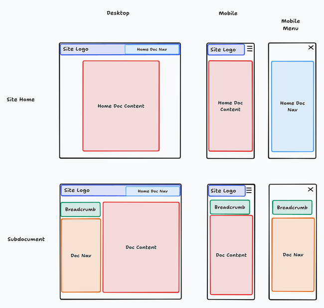 The Client is the app or web software that is responsible for rendering the Hypermedia Structure. The Body is the author-controlled area of a Site and Document. On the web Client, it takes up the whole window (matching the html <body>). In desktop Clients, it takes up the main view (under the app's title bar, right of the navigation sidebar, left of the panels, and above the app footer) Here we define the Presentation: how Sites and Documents should be rendered by the Client inside the Body. Visual summary of the suggested Presentation Site Header Navigation Breadcrumb Mobile Support