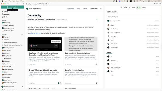 I wanted to allow Killian to create child documents on seed.hyper.media/community. Therefore, I gave him Writing Permissions to the community document. However, he can not only create documents on the document, but he can also modify the document itself; for example, he could delete the query block on the page. An alternative is for community members to use discussions on topics for participation.