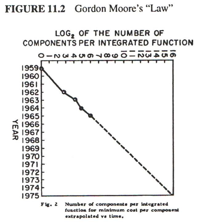 systems for large collections of weather data for the National Center for Atmospheric Research. I got interested in simulation in general—particularly of one machine by another—but aside from doing a one-dimensional version of a bit-field block transfer (bitblt) on a CDC 6600 to simulate word sizes of various machines, most of my attention was distracted by school, or I should say the theatre at school. While in Chippewa Falls helping to debug the 6600, I read an article by Gordon Moore which predicted that integrated silicon on chips was going to exponentially improve in density and cost over many years [Moore 65]. At the time in 1965, standing next to the room-sized freon-cooled 10 MIP 6600, his astounding predictions had little projection into my horizons.