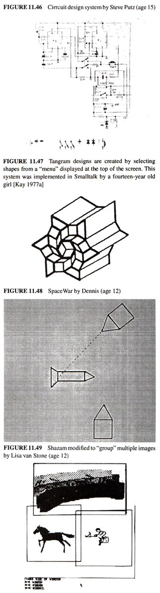 ISNEW » (SELF undraw. 'size <- size + :. SELF draw)What was so wonderful about this idea were the myriad of children's projects that could spring off the humble boxes. And some of the earliest were tools! This was when we got really excited. For example, Marian Goldeen's (12 yrs old) painting system was a full-fledged tool. A few years later, so was Susan Hamet's (12 yrs old) OOP illustration system (with a design that was like the MacDraw to come). Two more were Bruce Horn's (15 yrs old) music score capture system and Steve Putz's (15 yrs old) circuit design system. Looking back, this could be called another example in computer science of the "early success syndrome." The successes were real, but they weren't as general as we thought. They wouldn't extend into the future as strongly as we hoped. The children were chosen from the Palo Alto schools (hardly an average background) and we tended to be much more excited about the successes than the difficulties. In part, what we were seeing was the "hacker phenomenon," that, for any given pursuit, a particular 5% of the population will jump into it naturally, while the 80% or so who can learn it in time do not find it at all natural.
