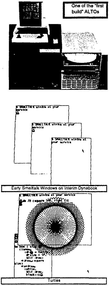 Putting all this together, we want an apparently free environment in which exploration causes desired sequences to happen (Montessori); one that allows kinesthetic, iconic, and symbolic learning—"doing with images makes symbols" (Piaget & Bruner); the user is never trapped in a mode (GRAIL); the magic is embedded in the familiar (Negroponte); and which acts as a magnifying mirror for the user's own intelligence (Coleridge). It would be a great finish to this story to say that having articulated this we were able to move straightforwardly to the design as we know it today. In fact, the UI design work happened in fits and starts in between feeding Smalltalk itself, designing children's experiments, trying to understand iconic construction, and just playing around. In spite of this meandering, the context almost forced a good design to turn out anyway. Just about everyone at PARC at this time had opinions about the UI, ours and theirs. It is impossible to give detailed credit for the hundreds of ideas and discussions. However, the consolidation can certainly be attributed to Dan Ingalls, for listening to everyone, contributing original ideas, and constantly building a design for user testing. I had a fair amount to do with setting the context, inventing overlapping windows, etc., and Adele and I designed most of the experiments. Beyond that, Ted Kaehler, and visitor Ron Baecker made highly valuable contributions. [Dan Halbert] designed SmallStar, the prototype iconic interface for the Xerox Star product.
