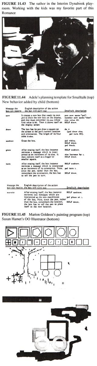 Now that I have summarized the "adult" activities (we were actually only semiadults) in Smalltalk up to 1976, let me return to the summer of '73, when we were ready to start experiments with children. None of us knew anything about working with children, but we knew that Adele Goldberg and Steve Weyer who were then with Pat Suppes at Stanford had done quite a bit and we were able to entice them to join us.