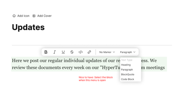 For mobile we can change the worded buttons to icon buttons and display this dropdown in the same interaction as we do the / Menu. (Notion was used as a reference for this)