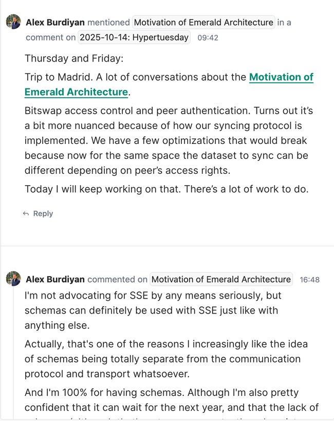 Mentions in the right panel look way too similar to comments. I was freaking out seeing a comment that I wrote for my daily update in a document. Until I realized that it's there just because it's a mention of the Emerald Architecture document.
