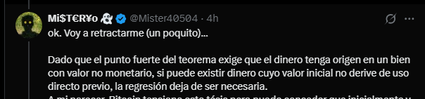 Tras el debate, dejo una reflexión más sobre el TR: Siempre se habla de una de las conclusiones que se obtienen del teorema (como en la siguiente foto: “el punto fuerte del teorema exige que el dinero tenga origen en un bien con valor no monetario”). Pero no se cita el teorema en sí. Por lo tanto, muchos creen que esa conclusión ES el teorema. Y esto no ayuda a su comprensión.